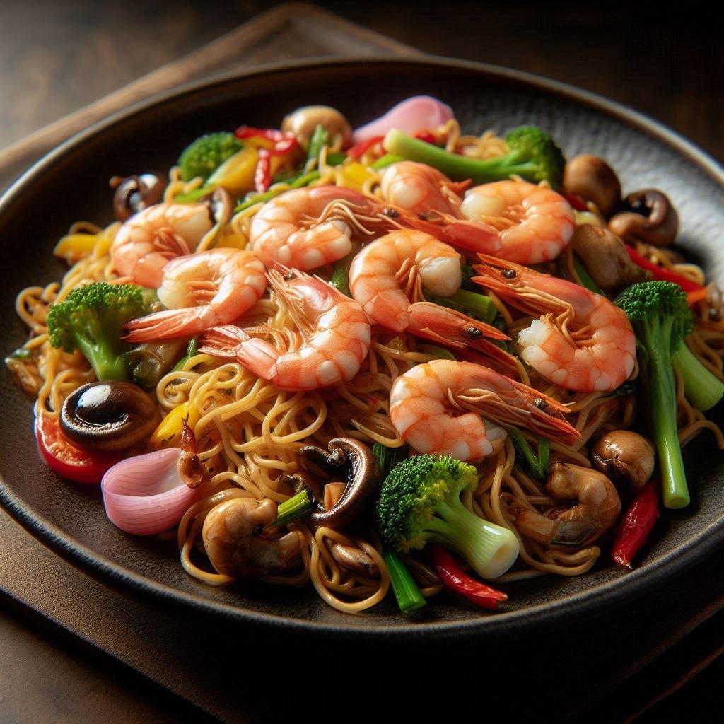 Noodles salteados no wok com gambas, descascadas e bem caramelizadas, misturados com cogumelos pretos asiáticos, brócolos e alho-francês aromático. Um prato leve, intenso e cheio de sabor — perfeito para quem ama o verdadeiro toque do wok.